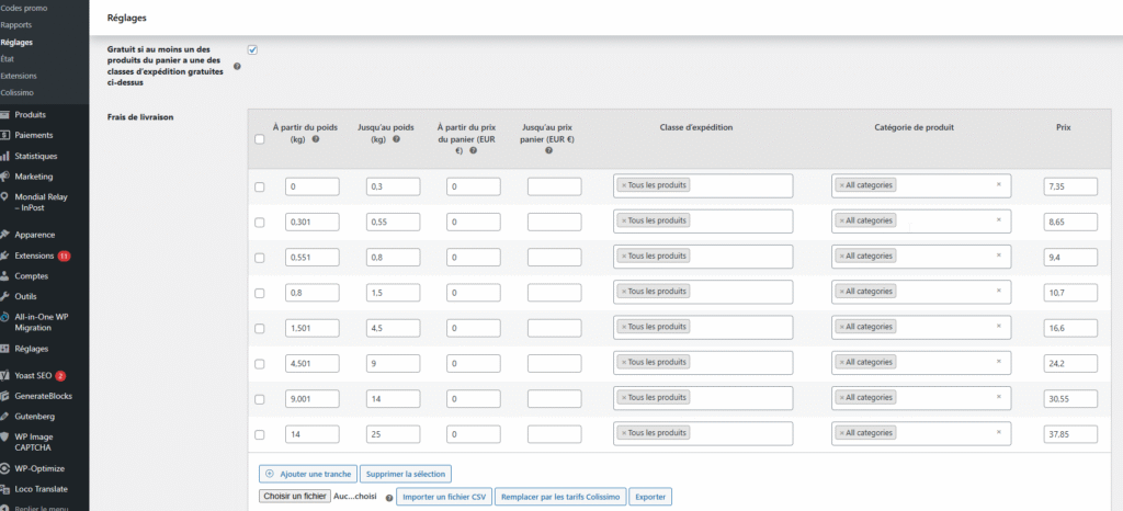 - Tarifs calculés en direct : Activez cette option pour permettre à Colissimo de calculer automatiquement les frais d’expédition en fonction du poids et de la destination.